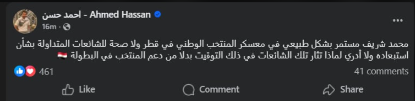 تحيا مصر، وكتب أحمد حسن عبر حسابه الرسمي” فيس بوك”: محمد شريف مستمر بشكل طبيعي في معسكر المنتخب الوطني في قطر ولا صحة للشائعات المتداولة بشأن استبعاده، ولا أدري لماذا تثار تلك الشائعات في ذلك التوقيت بدلاً من دعم المنتخب في البطولة”.