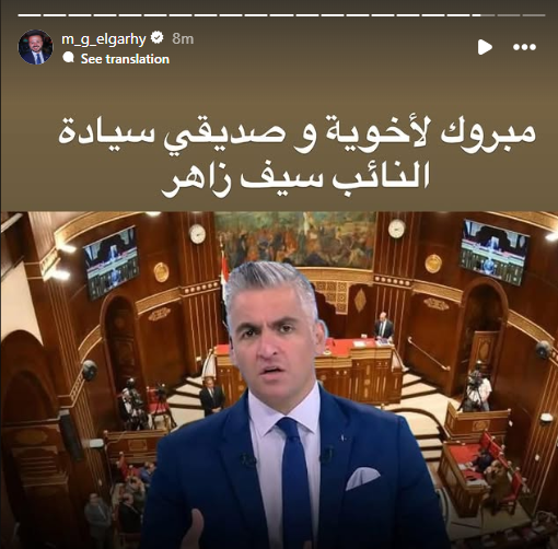 تحيا مصر، وكتب محمد الجارحي عبر حسابه الرسمي” إنستجرام”:” مبروك لأخويا وصديقي سيادة النائب سيف زاهر.