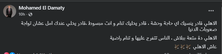 تحيا مصر، وكتب محمد الدماطي عبر حسابه الرسمي”فيس بوك”: الأهلي قادر ينسيك أي حاجة وحشة، قادر يخليك تنام وأنت مبسوط ،قادر يخلي عندك أمل عشان تواجة صعوبات الدنيا”.