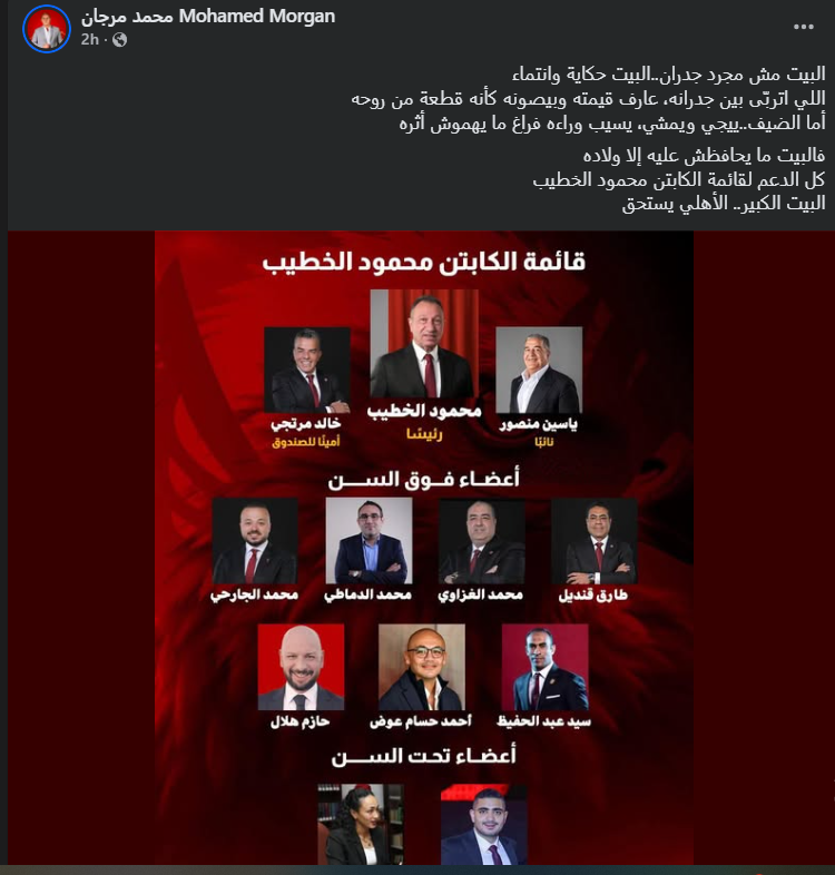وأختتم قائلاً:” أما الضيف ييجي ويمشي، يسيب وراءه فراغ ما يهموش أثره، فالبيت ما يحافظش عليه إلا ولاده، كل الدعم لقائمة الكابتن محمود الخطيب، البيت الكبير.. الأهلي يستحق”.