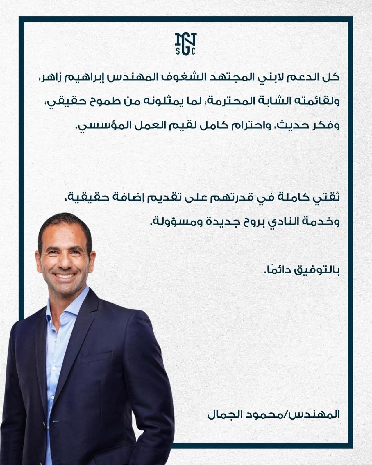 وأكد المهندس محمود الجمال، في منشور له عبر صفحة نادي نيو جيزة على فيسبوك، أن دعمه يأتي لابنه المجتهد الشغوف المهندس إبراهيم زاهر، وللقائمة الشابة المحترمة التي يمثلونها، مشيرًا إلى أنهم يجسدون طموحًا حقيقيًا وفكرًا حديثًا، مع احترام كامل لقيم العمل المؤسسي.
