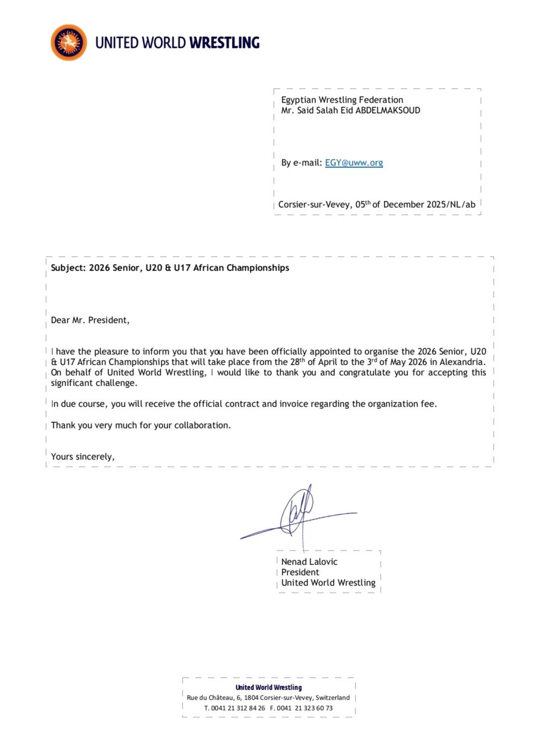 وارسل الاتحاد الدولي للمصارعة خطابات رسميا إلى رئيس الاتحاد المصري للمصارعة العميد سعيد صلاح، أكد خلاله اختيار مصر لاستضافة الحدث القاري الأهم في اللعبة.