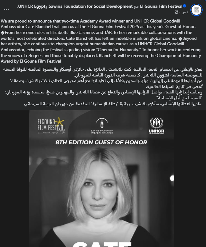 اعلنت إدارة مهرجان الجونة السينمائي، عن تكريم النجمة العالمية كيت بلانشيت، وذلك بمنحها جائزة بطلة الإنسانية المقدمة تقديرا لعطائها الإنسانس ودفاعها المستمر عن قضايا اللاجئين.