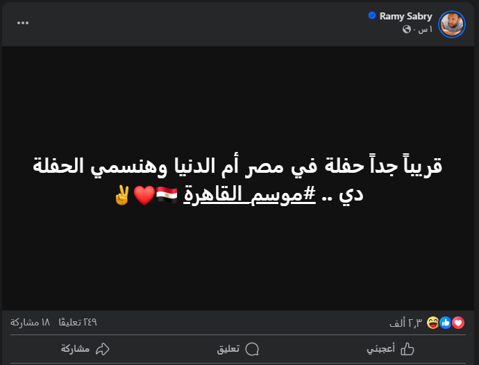 وكتب الفنان رامي صبري، منشورا يعلن من خلاله عن اقامته لحفل غنائي جماهيري قريبا، وفقا لما رصده موقع تحيا مصر، عبر صفحته الرسمية على موقع التواصل الاجتماعي فيسبوك، قال فيه: قريبًا جداً حفلة في مصر أم الدنيا وهنسمي الحفلة دي موسم القاهرة.