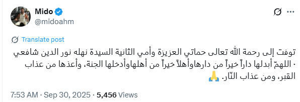 تحيا مصر، وكتب ميدو عبر حسابه الرسمي” أكس”:” توفت إلى رحمة الله تعالى حماتي العزيزة وأمي الثانية السيدة نهله نور الدين شافعي، اللهمّ أبدلها داراً خيراً من دارهاوأهلاً خيراً من أهلهاوأدخلها الجنة، وأعذها من عذاب القبر، ومن عذاب النّار”.