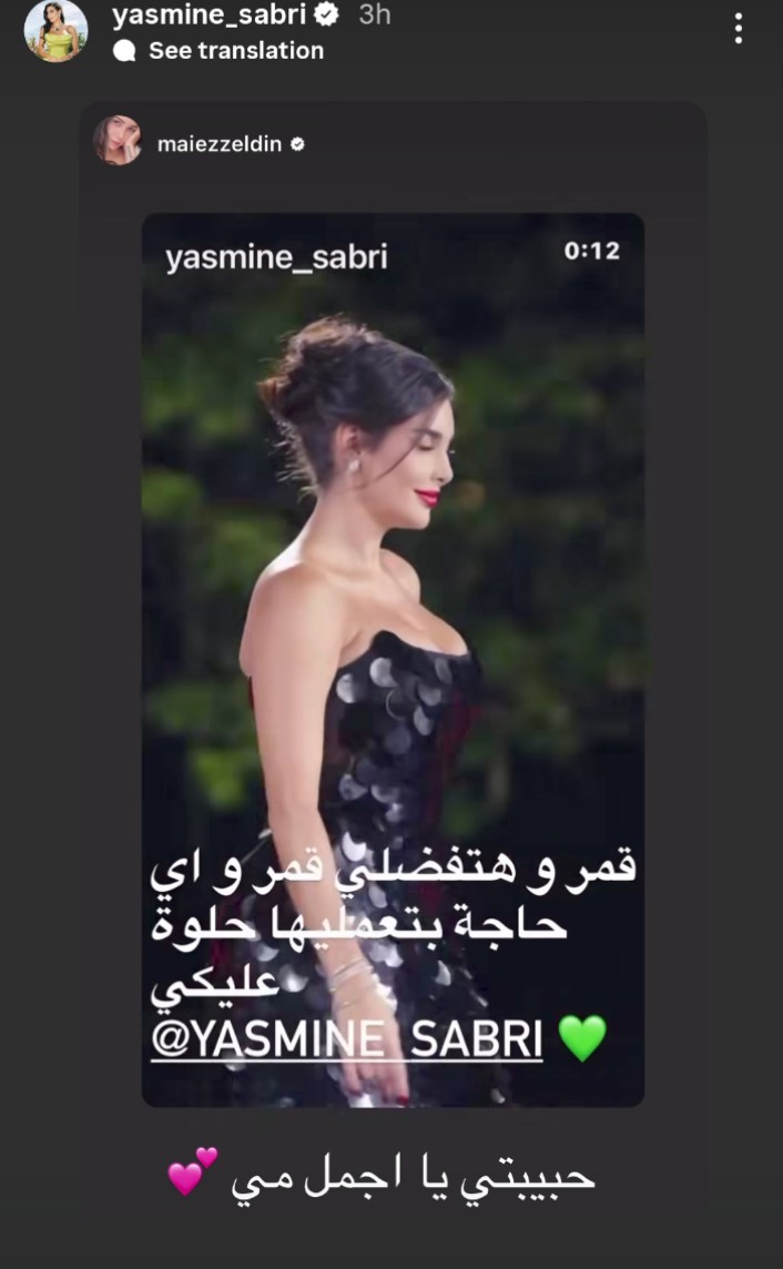 تحدثت الفنانة مي عز الدين عن إطلالة ياسمين صبري الأخيرة، معبرة عن إعجابها بها عبر حسابها الرسمي على موقع تبادل الصور والفيديوهات انستجرام: “قمر.. وأي حاجة بتعمليها بتليق عليكي”، وقامت ياسمين صبري بالرد عليها معبرة عن سعادتها بهذا التعليق، قائلة: “حبيبتي يا أجمل مي”، ورصد موقع تحيا مصر ردود أفعال النجمتين وهو ما لاقى استحسان المتابعين، الذين أشادوا بروح الدعم الإيجابية بين الفنانات، وابتعادهن عن أجواء المنافسة السلبية، مؤكدين أن العلاقات الراقية داخل الوسط الفني تضيف للمشهد مزيدًا من الجمال والاحترام.