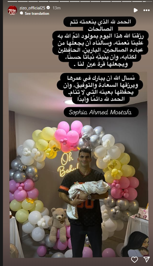 رزق أحمد سيد”زيزو”، نجم النادي الأهلي ومنتخب مصر، بمولودته الثانية، حيث اطلق عليها أسم” صوفيا”، وذلك بعد أيام من تأهل المنتخب الوطني لكأس العالم 2026.