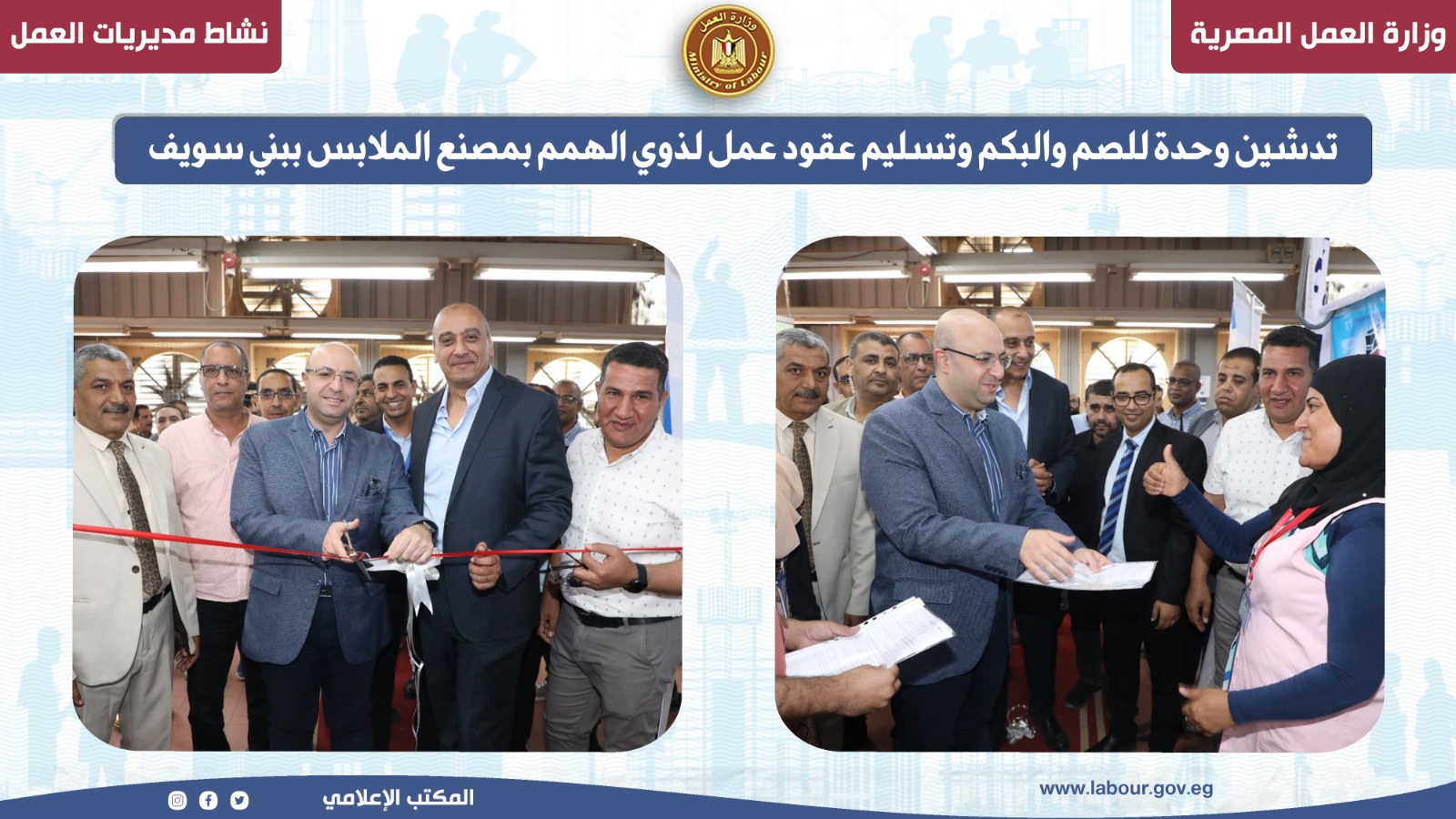 أعلنت مديرية العمل بمحافظة بني سويف عن تدشين وحدة للصم والبكم داخل مصنع السويسرية للملابس، بالتعاون مع إدارة المصنع، وذلك بحضور الدكتور محمد هاني غنيم محافظ بني سويف، ومدير المديرية أحمد العربي، في إطار حرص الوزارة على دمج ذوي الهمم في بيئة العمل. كما تم خلال الفعالية تسليم 11 عقد عمل لعدد من الشباب من ذوي الهمم، في خطوة لدعم فرص التشغيل لهم داخل المنشآت الإنتاجية الكبرى.
