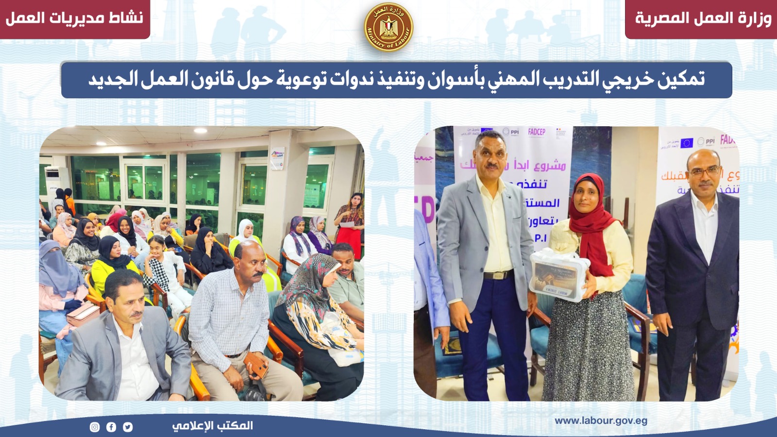 3-تمكين خريجي التدريب المهني بأسوان.. وتنفيذ ندوات توعوية حول قانون العمل الجديد