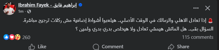 تحيا مصر، وكتب إبراهيم فايق عبر حسابه الرسمي”فيس بوك”: إذا تعادل الاهلي والزمالك في الوقت الأصلي.. هيلعبوا أشواط إضافية مش ركلات ترجيح مباشرة”.