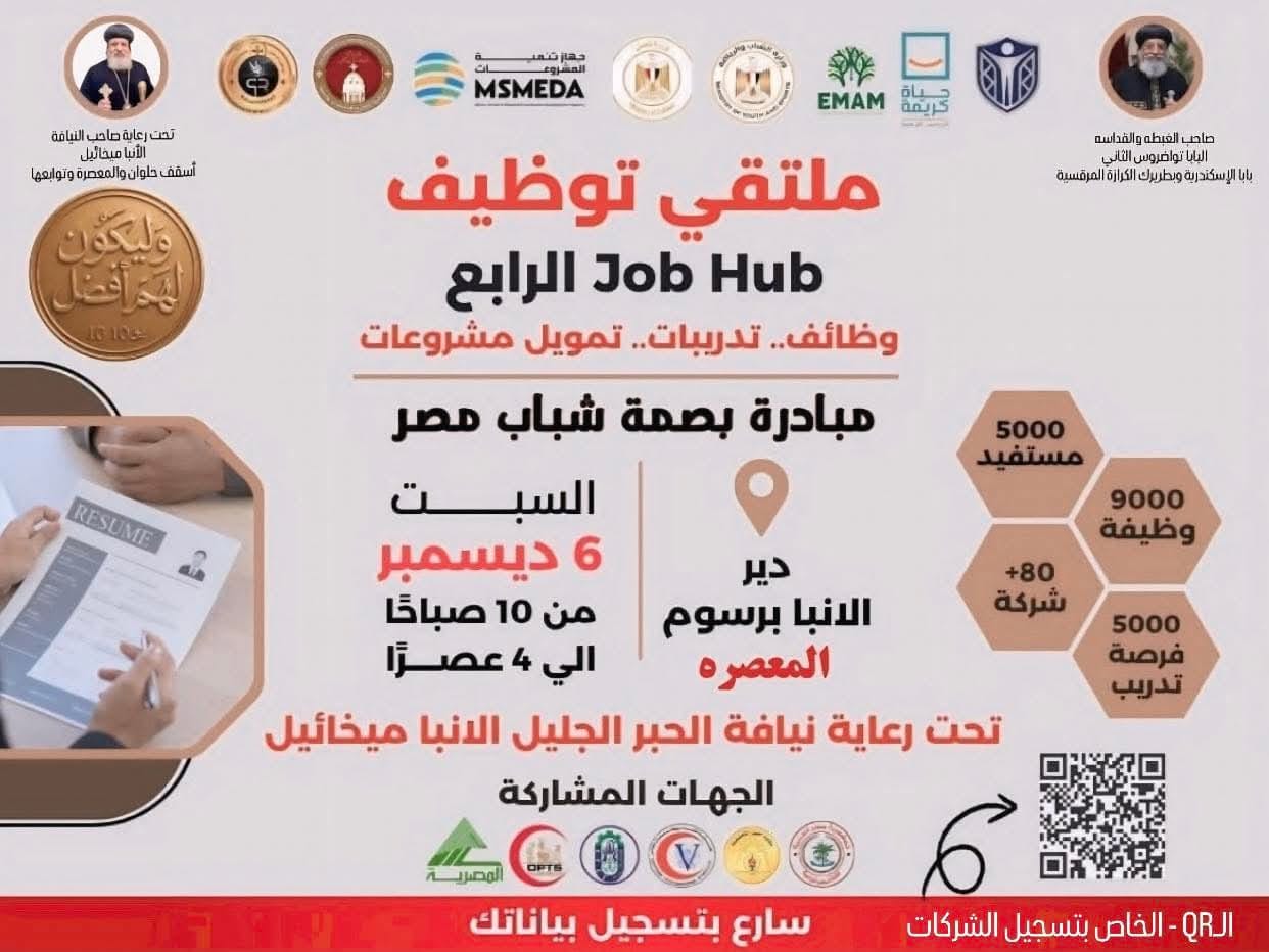 في إطار تنفيذ توجيهات وزير العمل محمد جبران ، لتعزيز فرص التشغيل ودعم الشباب، أناب الوزير جوزيف رضا، مدير عام التطوير المؤسسي بوزارة العمل لحضور فعاليات ملتقى توظيف مبادرة “بصمة شباب مصر” – JOB HUB 4، الذي نظمته مطرانية حلوان وتوابعها.