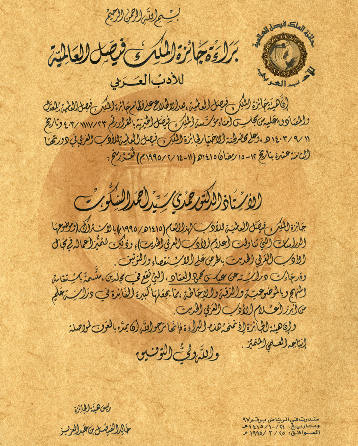 ببالغ الحزن والاسى وقلوب مؤمنه بقضاء الله وقدره ننعى وفاة البروفيسور حمدي سيد أحمد السكّوت أستاذ الأدب بالجامعة الأمريكية، الفائز بالاشتراك بجائزة الملك فيصل في اللغة العربية والأدب لعام 1995