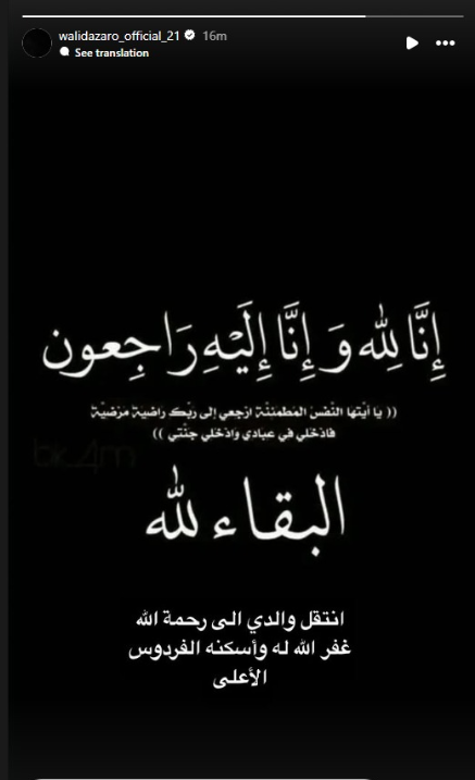 أُعلن المغربي اللاعب المغربي وليد أزارو، مهاجم النادي الأهلي المصري السابق، وفاة والده منذ قليل.