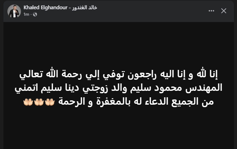 تحيا مصر، وكتب خالد الغندور عبر حسابه الرسمي”فيس بوك”: إنا لله و إنا اليه راجعون توفي إلي رحمة الله تعالي المهندس محمود سليم والد زوجتي دينا سليم اتمني من الجميع الدعاء له بالمغفرة و الرحمة”.