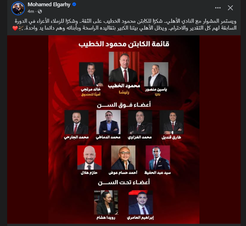 تحيا مصر، وكتب محمد الجارحي عبر “فيس بوك”: ويستمر المشوار مع النادي الأهلي شكرًا للكابتن محمود الخطيب على الثقة، وشكرًا للزملاء الأعزاء في الدورة السابقة لهم كل التقدير والاحترام”.