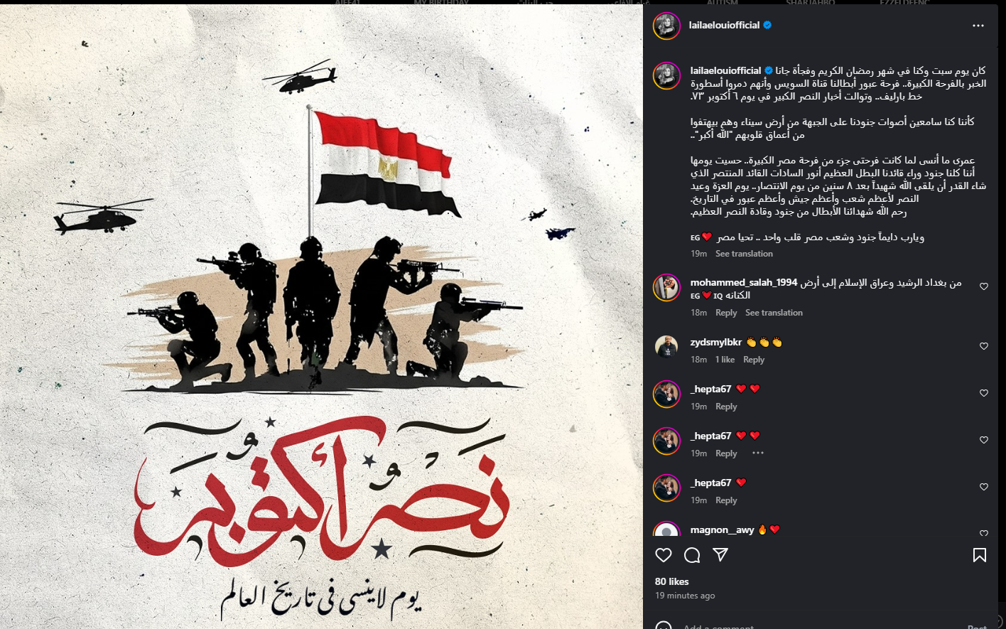 وكتبت الفنانة ليلى علوي، منشورا، تحتفل فيه بذكرى انتصارات أكتوبر، وفقا لما رصده موقع تحيا مصر، عبر صفحتها الرسمية على موقع التواصل الاجتماعي إنستجرام، قالت فيه: كان يوم سبت وكنا في شهر رمضان الكريم وفجأة جانا الخبر بالفرحة الكبيرة، فرحة عبور أبطالنا قناة السويس وأنهم دمروا أسطورة خط بارليف، وتوالت أخبار النصر الكبير في يوم 6 أكتوبر سنة 73، كأننا كنا سامعين أصوات جنودنا على الجبهة من أرض سيناء وهم بيهتفوا من أعماق قلوبهم “الله أكبر”.