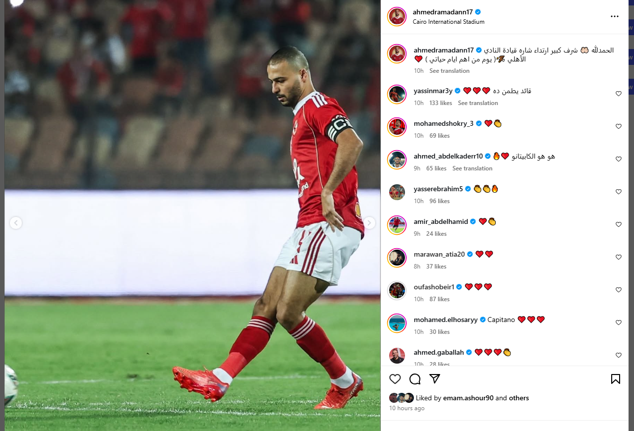 تحيا مصر، وكتب أحمد رمضان بيكهام عبر حسابه الرسمي”انستجرام”: الحمدلله شرف كبير ارتداء شارة قيادة النادي الأهلي يوم من أهم أيام حياتي”.