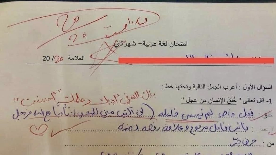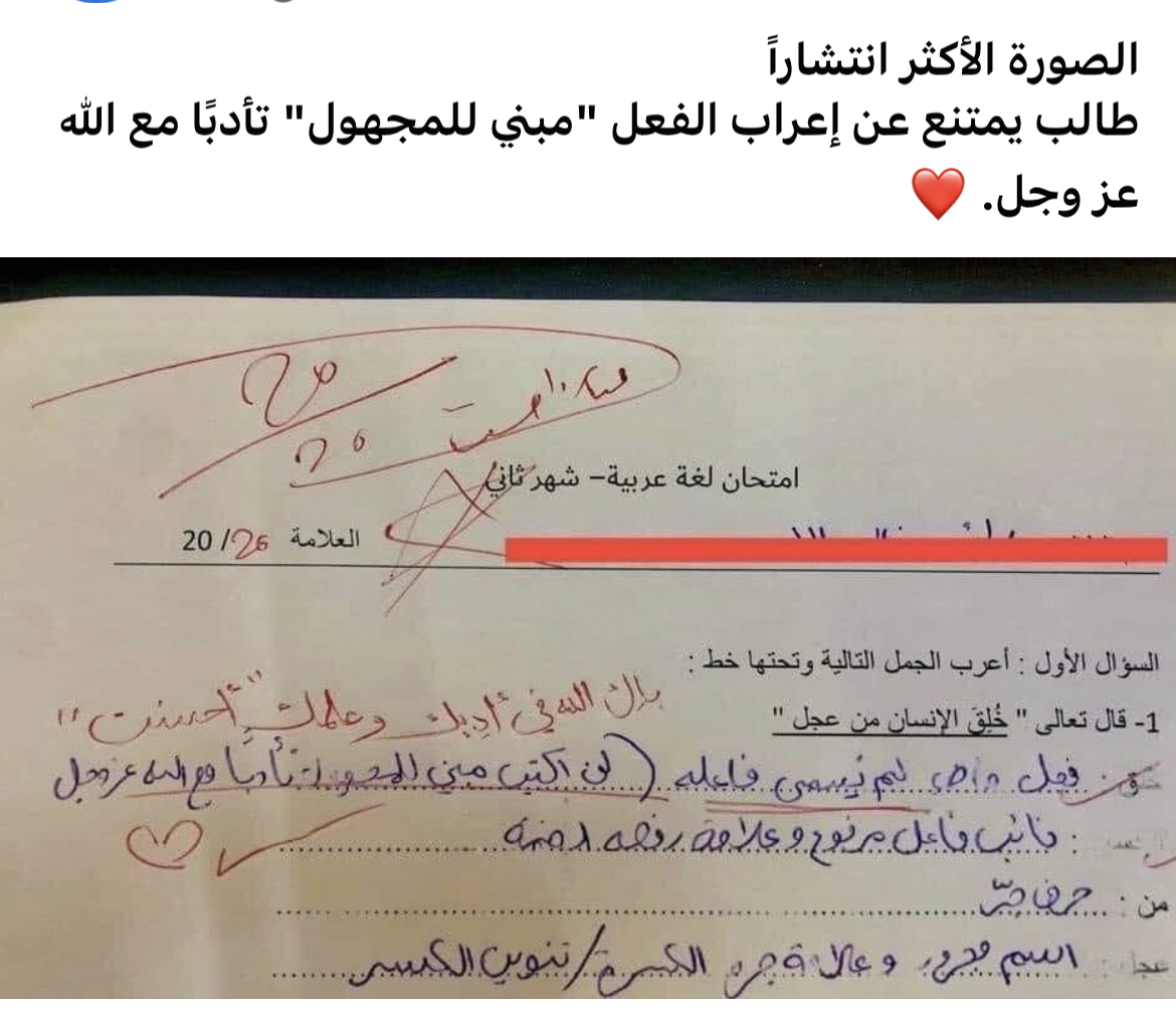 وتضمنت ورقة الأسئلة في بدايتها سؤالاً لإعراب الآية الكريمة: “خُلِقَ الإِنسَانُ مِنْ عَجَلٍ”، ومن خلال ورقة الإجابة المتداولة، امتنع الطالب عن إعراب كلمة “خُلق” بالطريقة النحوية التقليدية كفعل “مبني للمجهول”، حيث دوّن إجابته قائلاً: “خُلق: فعل ماضٍ لم يُنسَ فاعله (لن أكتب مبني للمجهول تأدباً مع الله عز وجل)”.