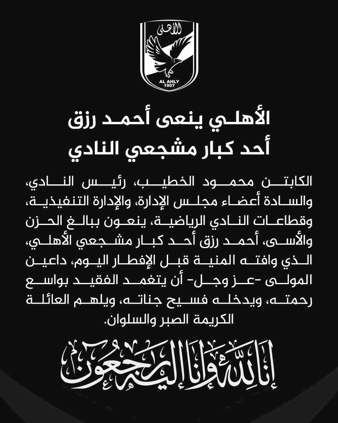 وفاة أحمد رزق أحد كبار مشجعي الأهلي.. والنادي ينعيه رسميًا