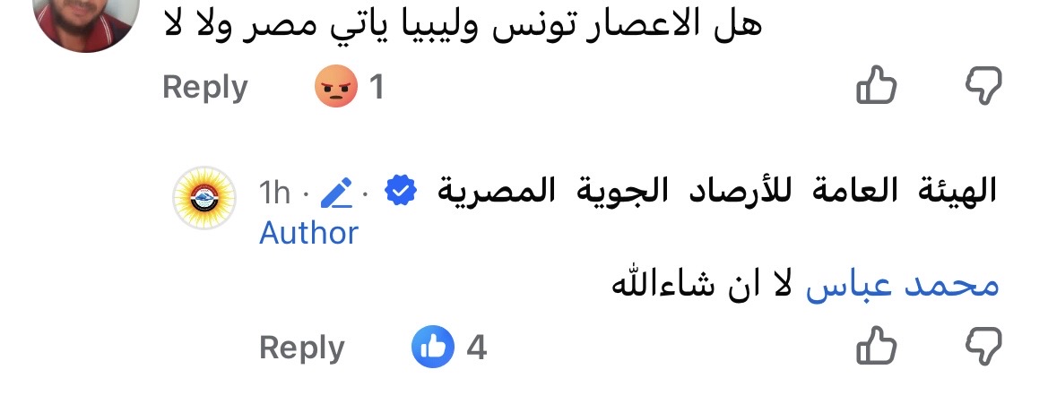 أكدت هيئة الأرصاد الجوية، عبر حسابها الرسمي على موقع التواصل الاجتماعي، عدم تأثر مصر بإعصار تونس وليبيا، وذلك بعد انتشار بعض التساؤلات بين المتابعين حول احتمالية تأثير الإعصار على الأوضاع الجوية في البلاد، وأوضحت الهيئة أنه، بحسب المتابعات والرصد المستمر لحالة الطقس عبر الأقمار الصناعية، لن تتعرض مصر لأي إعصار خلال الفترة الحالية.