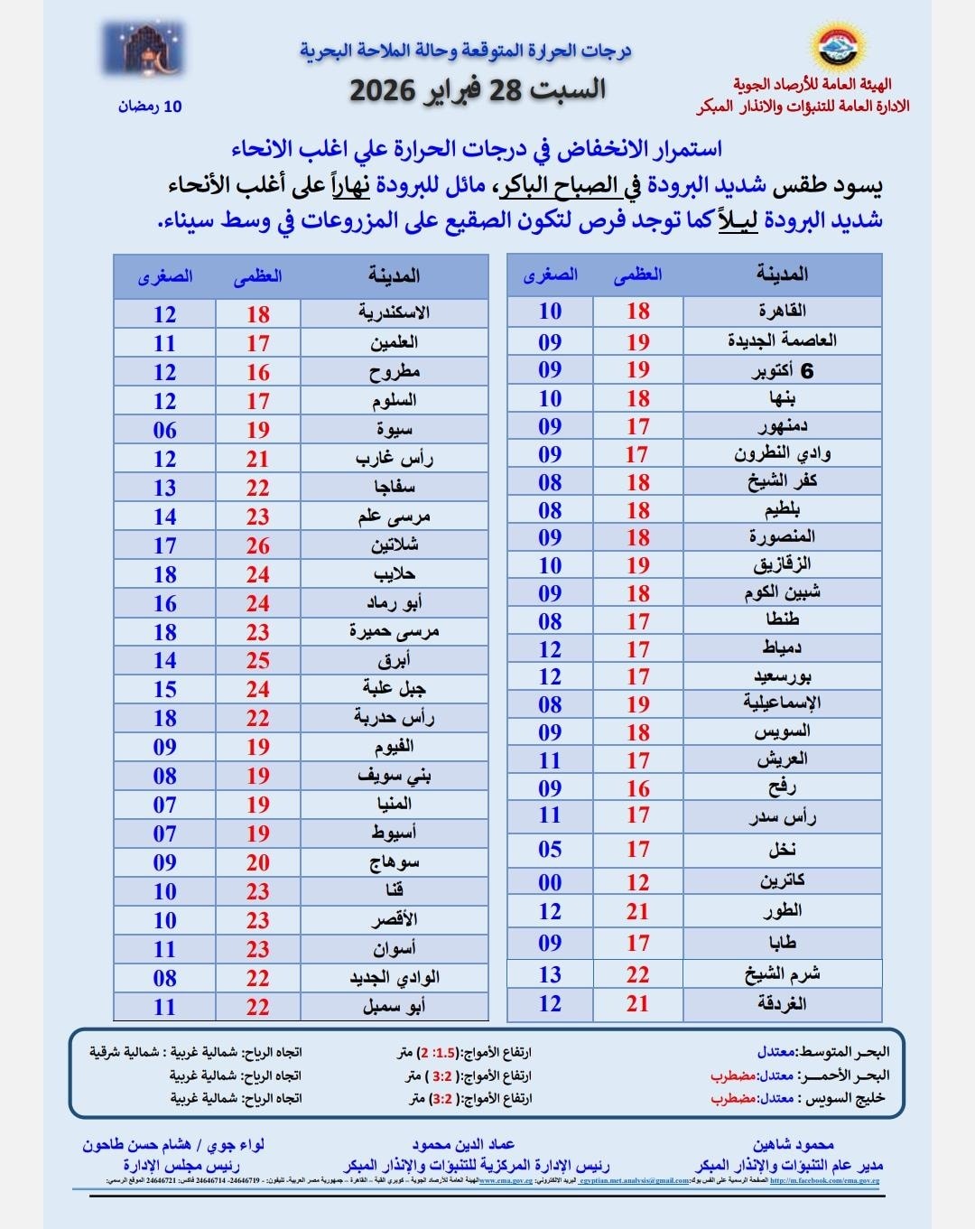 تتوقع الهيئة العامة للأرصاد الجوية أن يشهد اليوم السبت 28 فبراير 2026، استمراراً في انخفاض درجات الحرارة، ليسود طقس شديد البرودة في الصباح الباكر، ويميل للبرودة نهاراً على أغلب الأنحاء، بينما يعود ليصبح شديد البرودة ليلاً، مع تزايد الفرص لتكون الصقيع على المزروعات في مناطق وسط سيناء.