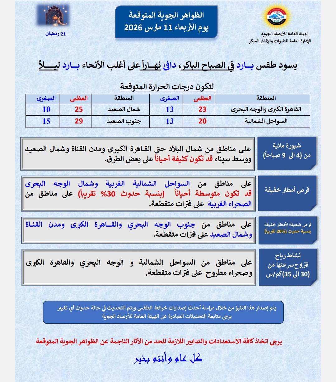 تتوقع الهيئة العامة للأرصاد الجوية أن يشهد طقس غداً الأربعاء الموافق 11 من شهر مارس لعام 2026 ارتفاعاً طفيفاً في درجات الحرارة على كافة الأنحاء، ليسود طقس بارد في ساعات الصباح الباكر بينما يصبح دافئاً نهاراً على أغلب المناطق ويعود ليصبح بارداً ليلاً مع غياب أشعة الشمس.