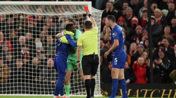 أغرب بطاقة حمراء في التاريخ.. طرد لاعب إيفرتون لاشتباكه مع زميله (فيديو)